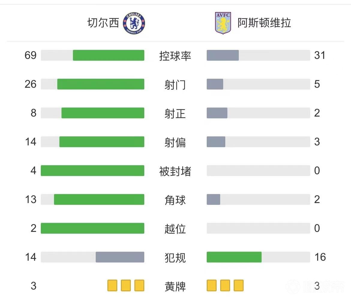 全场比赛结束,切尔西0-2阿斯顿维拉两轮不胜!