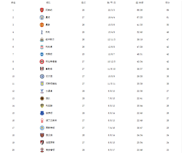 英超最新排名!阿森纳8分领跑 曼城曼联压力大