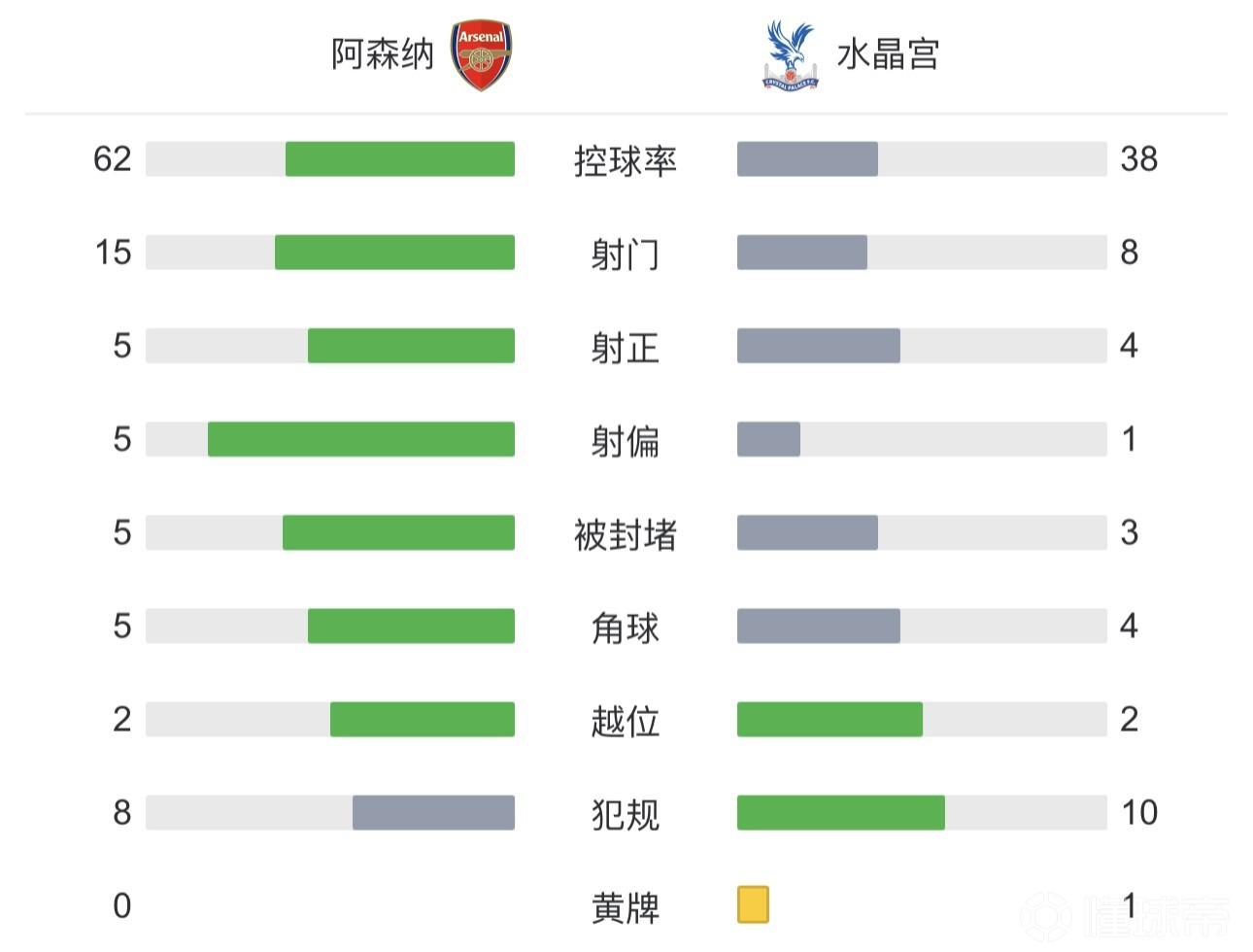 最终,阿森纳4-1击败水晶宫,取得联赛6连胜,多赛一场8分领跑。