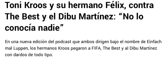 来源:24直播网03-02 17:2324直播网讯03月02日国际足联年度最佳颁奖典礼已经结束,尽管各大奖项已经尘埃落定,但一些质疑声却依然没有消失。北京时间3月1日晚,皇马巨星托尼-克罗斯和他的弟弟菲利克斯-克罗斯,在一档播客节目Einfach mal Luppen中谈到了对于得奖结果的看法。菲利克斯-克罗斯语出惊人表示,梅西不是过去1年的最佳球员,大马丁当选最佳门将更是个笑话。