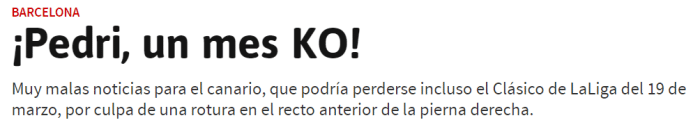 该媒体表示,佩德里在巴萨2-2战平曼联的比赛中伤退,赛后他被诊断为右大腿肌肉撕裂,预计将会缺席1个月的时间。