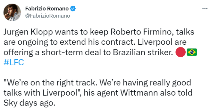 罗马诺表示,克洛普想留下菲尔米诺,续约的谈判正在进行,利物浦准备给菲尔米诺提供一份短期合同。