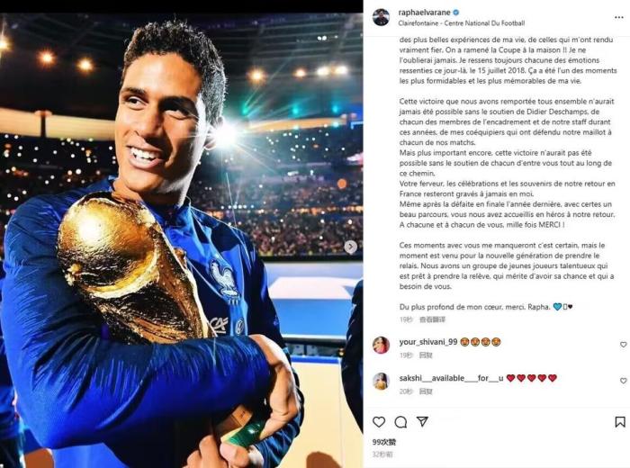 十年来,代表我们美丽的国家是我一生中最大的荣誉之一。每次我穿这件特别的蓝色球衣,我都会感到非常自豪。每次我们进入球场时,都有责任付出一切,用我的心去比赛,并赢得胜利。我已经考虑了几个月了,我决定现在是我在法国队退休的合适时机。
