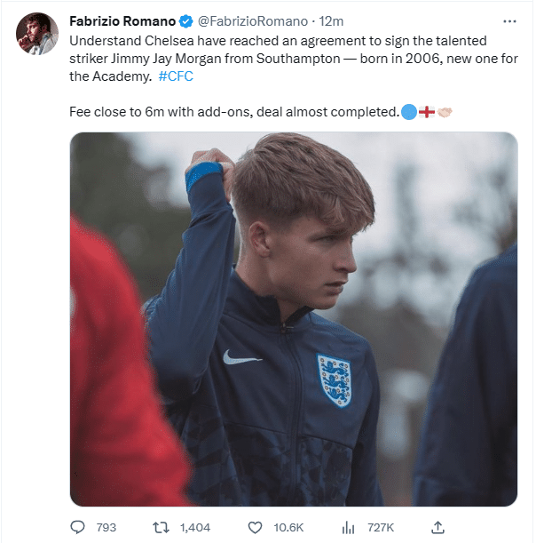 罗马诺写道:切尔西已经与南安普顿达成协议,签下南安普顿的前锋吉米·杰伊·摩根,球员加盟后会进入蓝军青训梯队。