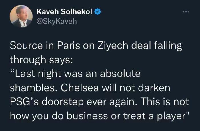 该记者表示,巴黎方面的认为昨晚发生的事情太糟糕了,巴黎以后也不会与切尔西再做生意,这不是正确的对待转会和球员的方式。