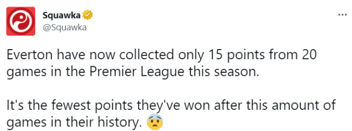24直播网01月22日讯 赛后,据squawka统计,埃弗顿在20场比赛之后只有15个联赛积分,创造了队史英超同期最差成绩。