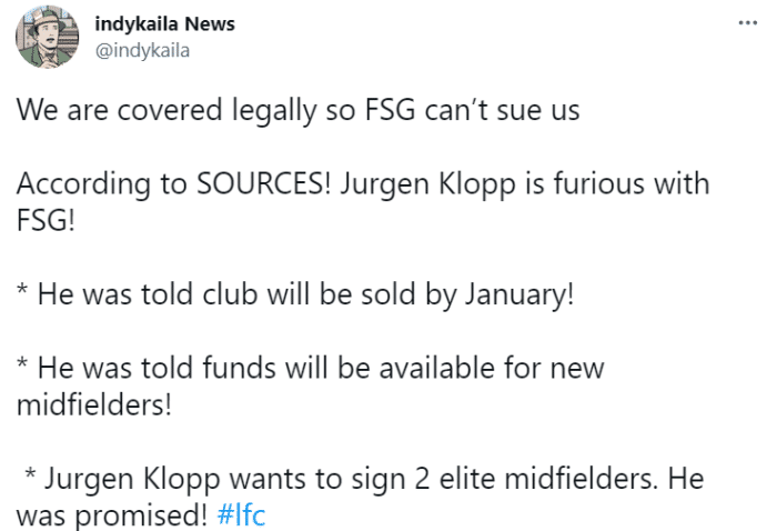 24直播网01月09日讯 据利物浦新闻记者indykaila(球迷给其绰号绿帽哥)报道,利物浦主帅克洛普对芬威集团感到愤怒和不满。