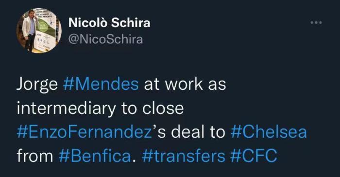 今日斯基拉跟进报道,著名的经纪人门德斯在作为中间人极力推动恩佐加盟切尔西的交易。