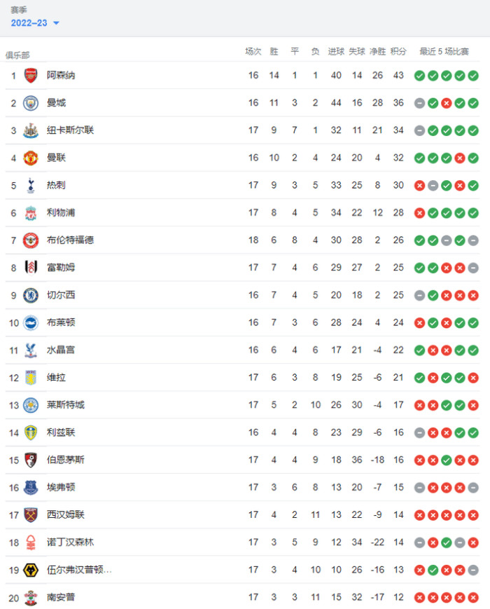 阿森纳43分仍居第一,曼城36分第二,纽卡斯尔多赛一轮34分第三,曼联则32分第四。