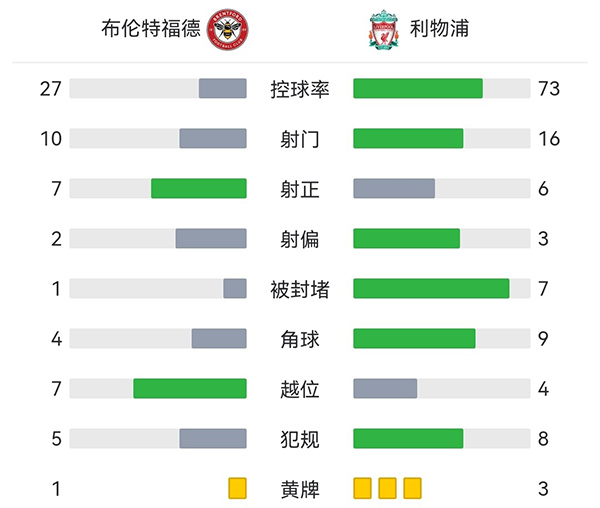 全场比赛结束,最终布伦特福德3-1利物浦。