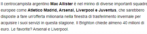 24直播网12月31日讯 据意大利媒体tuttojuve报道,阿森纳和利物浦最有可能签下阿根廷中场麦卡利斯特。