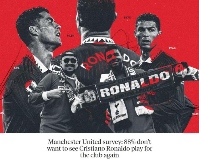 在TA的问卷调查中,93.7%的球迷认为C罗在采访后应该受到曼联的纪律处分,94.2%的球迷认为曼联应该在冬窗寻求出售C罗,86.2%的球迷认为冬窗过后C罗不会再效力曼联,84.8%的球迷认为曼联应该解约C罗。