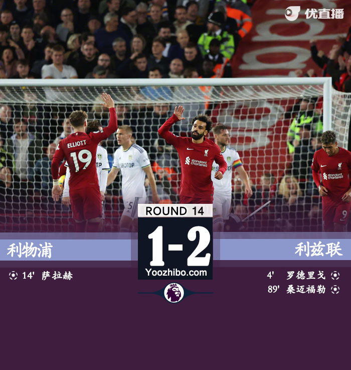 全场比赛结束,利物浦1-2遭到利兹联绝杀。