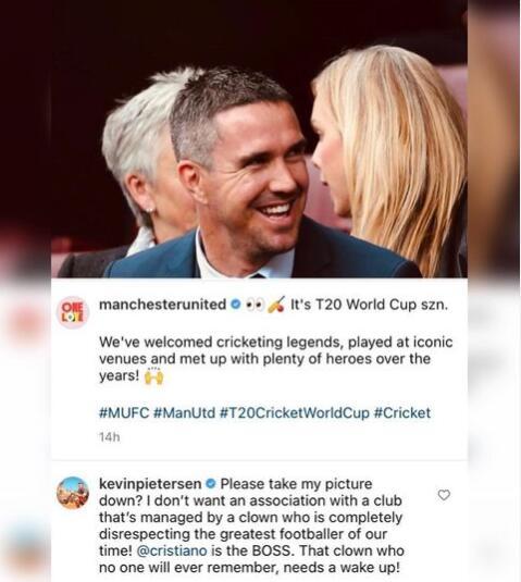 曼联官方发文,欢迎板球传奇造访老特拉福德。不过皮特森回复:“请撤下我的照片,好吗?我不想和一个小丑教练执教的俱乐部有任何瓜葛,他对历史最佳球员完全缺乏尊重。C罗才是大腕,那个没人记得的小丑,快醒醒!”