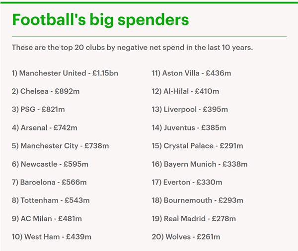 并不是花钱最多就能最为成功,CIES足球天文台公布的一项数据显示,过去10个赛季曼联的转会净支出世界第一,在球员买卖上净支出高达11.5亿英镑,成为唯一突破10亿大关的俱乐部。排名第二的切尔西,净支出仅有8.92亿英镑。