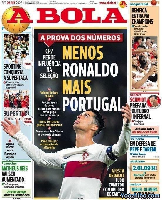 而来自葡萄牙另外一家知名媒体《晨邮报》的爆料,部分葡萄牙队友也对C罗不可触动的队内地位产生了质疑,尽管他们非常尊重这位老大哥,但在国家队队友看来,现在的C罗不应该是葡萄牙不可触动的成员。
