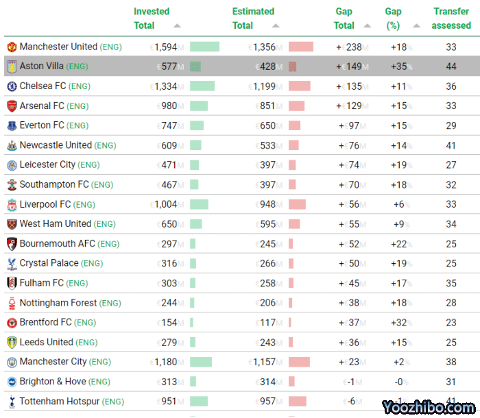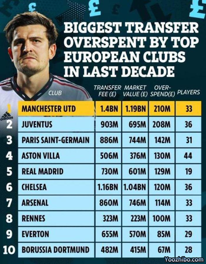 当然,买人溢价是英超各大俱乐部的通病,只是程度大小的问题,曼联是其中的佼佼者。排名第二的是阿斯顿维拉,买人多花了1.49亿欧元,切尔西(1.35亿欧元)、阿森纳(1.29亿欧元)和埃弗顿(9700万欧元)排在三至五位。