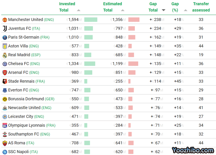 来源:24直播网09-21 16:1324直播网09月21日曼联在转会市场上的引援水平一直备受嘲讽,数据也证实了这些批评并非毫无道理。「CIES足球瞭望台」最近公布的一项调查结果显示,2012年至今的10年转会中,曼联引进33名球员,实际花费的转会费比估值高出近2.4亿欧元!这在欧洲五大联赛(英超、西甲、德甲、意甲和法甲)中排名第一,就是买人的头号「冤大头」。