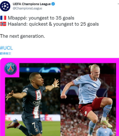 来源:24直播网09-07 17:2824直播网09月07日讯 欧冠重燃战火,哈兰德和姆巴佩都有亮眼的表现,姆巴佩面对尤文图斯梅开二度,哈兰德在对阵塞维利亚的时候也完成双响,不出意外的话,这对“新绝代双骄”将会争夺本赛季欧冠金靴。包括欧冠官推也晒除了姆巴佩和哈兰德的照片,配文:下一代。