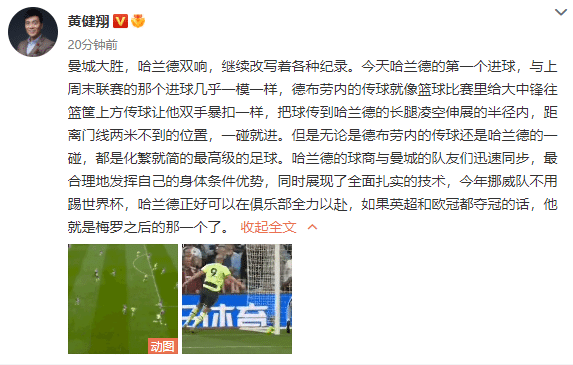 知名足球人黄健翔在社交媒体上点评哈兰德的时候也盛赞有加,他谈到了哈兰德的进球方式,最合理地发挥自己的身体条件优势,同时展现了全面扎实的技术,同时称赞德布劳内的传球非常到位。黄健翔表示哈兰德今年不用踢世界杯,这对于他来说并不算坏事,可以在俱乐部全力以赴的表现。黄健翔还断言,称:如果英超和欧冠都夺冠的话,他就是梅罗之后的那一个了。