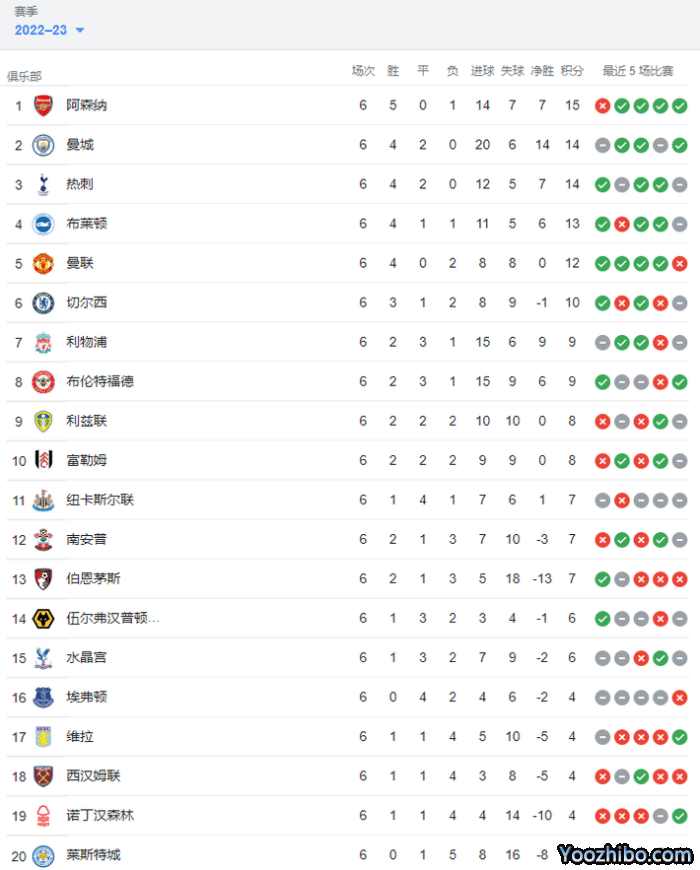 阿森纳输球后6轮15分仍然领跑,曼城热刺少1分排名二三,海鸥布莱顿6轮13分排名第四。