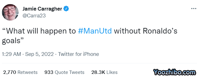 24直播网09月05日讯 今天凌晨,曼联英超联赛中3-1击败阿森纳,赛后利物浦名宿卡拉格在推特发文调侃了C罗和他的球迷。