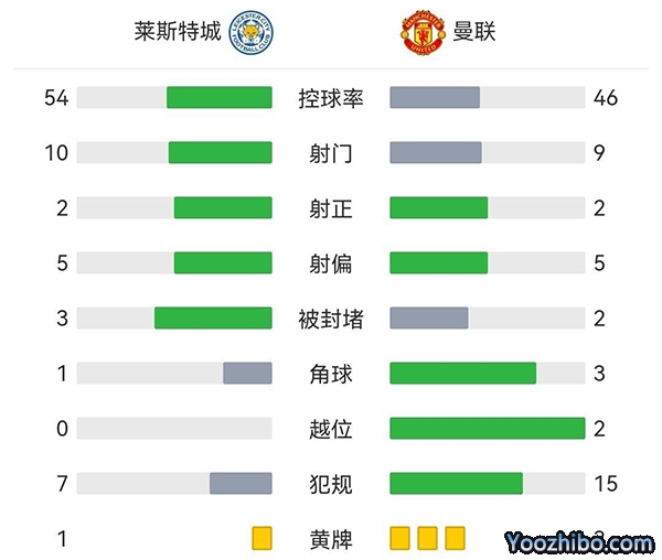 全场比赛结束,曼联客场1-0战胜莱斯特城。