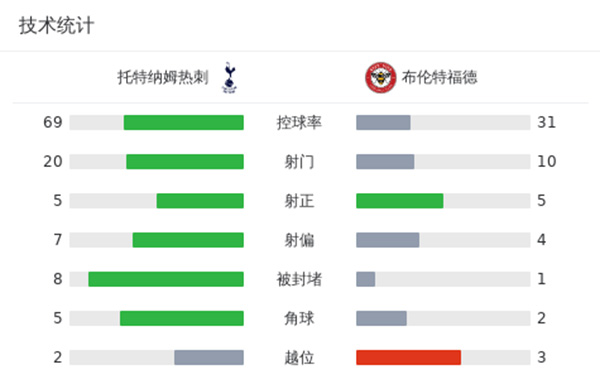 热刺3-2布伦特福德 乌多吉破门+回传送礼麦迪逊伤退