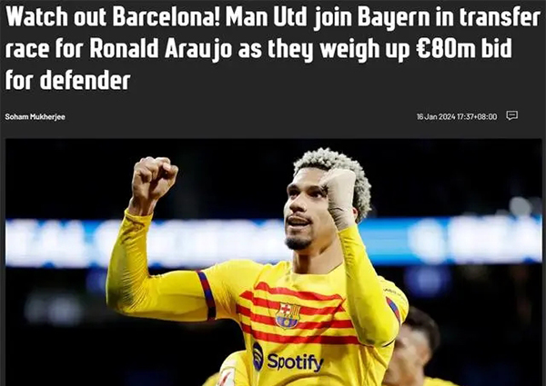 24直播网01月17日讯 据德国天空电视台报道,曼联是最新一支对阿劳霍感兴趣的球队,并已向巴塞罗那提出正式报价。