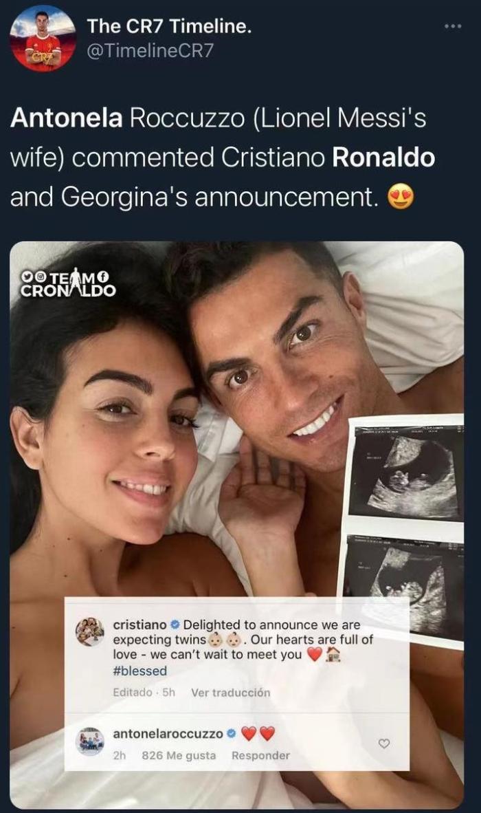 24直播网10月30日讯 ,C罗在个人社交媒体宣布乔治娜怀上双胞胎,随后梅西的妻子安东内拉送上祝福。