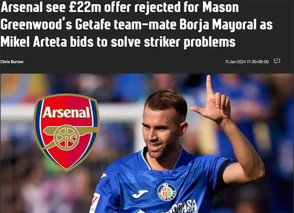 24直播网01月12日讯 据《太阳报》报道,阿森纳2200万英镑报价赫塔菲前锋博尔哈-马约拉尔遭拒。赫塔菲坚持要价接近3900万英镑。