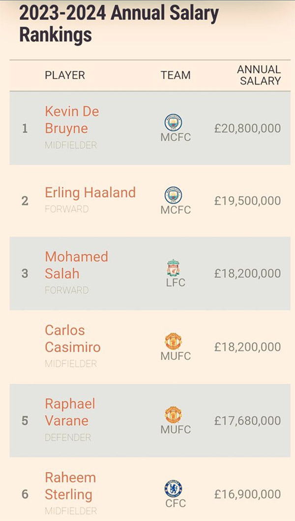 只有曼城双星埃尔林·哈兰德和收入最高的德布劳内比他们更高,瓦拉内则以1768万英镑年薪位居第五。