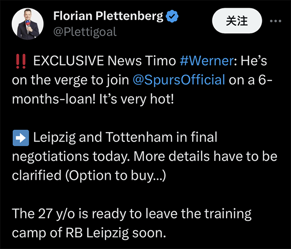 来源:24直播网01-06 18:3024直播网01月06日讯 ,来自德国天空体育知名记者Florian Plettenberg的最新消息,效力于莱比锡红牛的前锋维尔纳,即将租借加盟热刺半年。莱比锡与热刺正在进行最后的谈判,双方在讨论更多的细节(买断条款等)。如果交易达成,这将会是27岁的德国国脚时隔1年半后,重返英超联赛踢球。