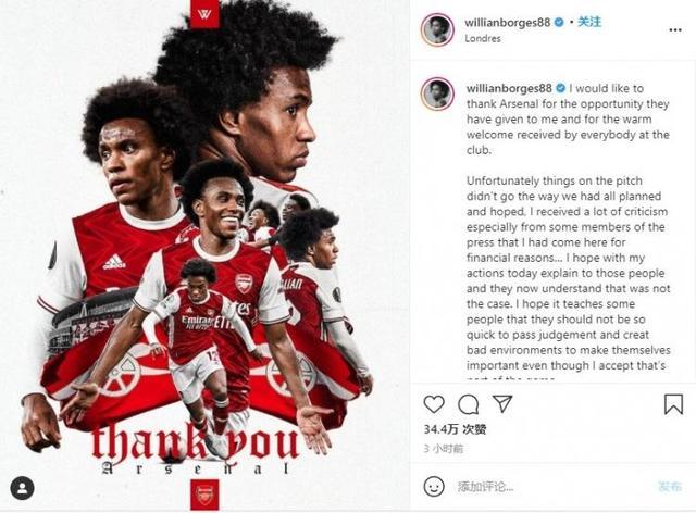 威廉随后在社媒上发长文告别了俱乐部、球迷们。