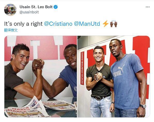 ,作为C罗的好友以及红魔球迷的尤塞恩-博尔特更新个人社交媒体,庆祝C罗重返曼联。