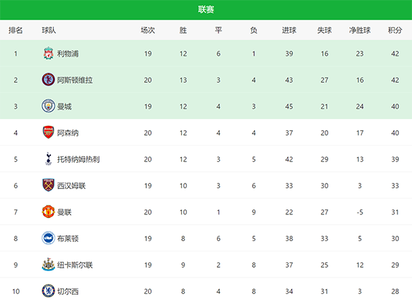 利物浦排名第一,本赛季的利物浦一度表现不够稳定,但后期实现反弹,本赛季至今,他们在联赛层面仅仅丢了16个球,是丢球最少,也是唯一一支丢球数在20球以内的队伍。不过后期萨拉赫会参加非洲杯,对于利物浦一定会有影响,所以后半段能否顶住压力,是利物浦冲击英超冠军的关键。