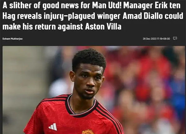 滕哈格:阿马德-迪亚洛可能在对阵阿斯顿维拉的比赛中复出