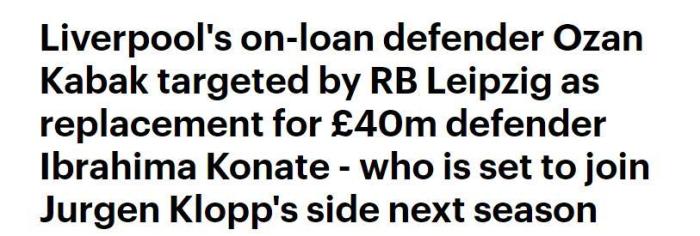 《邮报》表示,利物浦将引进莱比锡中卫科内特,这需要花费他们大约4000万欧元,因此红军不会再花钱买断卡巴克。