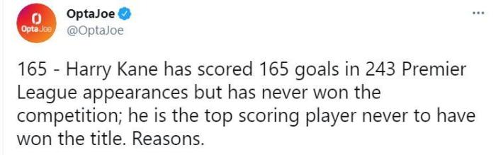 24直播网讯 据知名数据网站opta统计,热刺前锋凯恩目前已经打进165粒英超进球,是英超未夺冠球员中进球最多的。