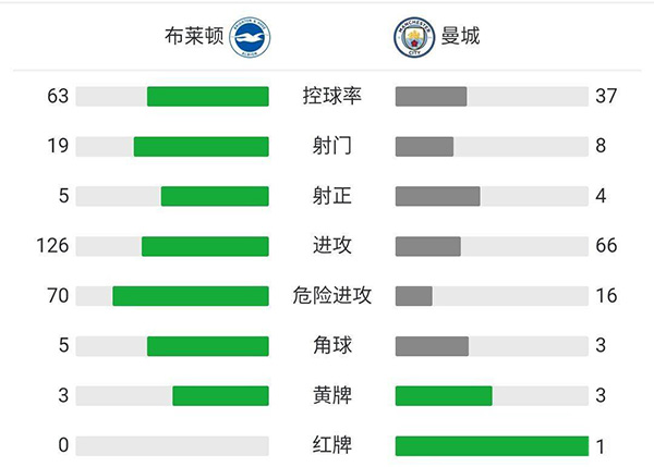 全场比赛结束,最终曼城2-3被布莱顿逆转。
