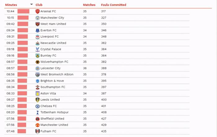 与此同时,阿森纳则是英超最干净的球队,他们只有307次犯规,比曼联少了一百二十多次。
