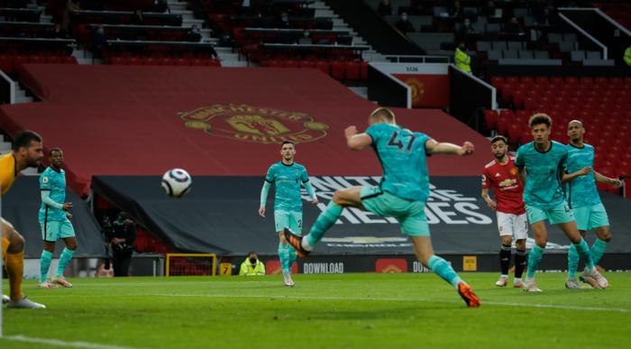 比赛开场10分钟,第50次为曼联出战英超的费尔南德斯就打破了僵局,他的外脚背射门被利物浦后卫菲利普斯折射打入自家球门。英超官方认定这是曼联新核的入球,因此他的赛季进球数达到28粒,超越兰帕德,成为联赛历史上中场球员单赛季进球最多的一人。