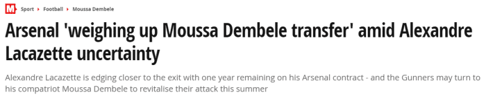 由于拉卡泽特和恩凯蒂亚都可能离队,枪手有意签下登贝莱加强锋线,《电讯报》称他的转会费未2500万英镑。