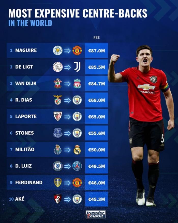 排名榜首的是曼联从莱斯特城签下的马奎尔,曼联为其花费了8700万欧元,而排名第二的是的德里赫特,尤文从阿贾克斯签下他的时候,花费了8550万欧元,第三的是范迪克,利物浦签下他花费了8470万欧元。而第四是迪亚斯,曼城从本菲卡签下他的时候,花费了6800万欧元,第五的是拉波尔特,曼城从毕巴签下他的时候,花费了6500万欧元。