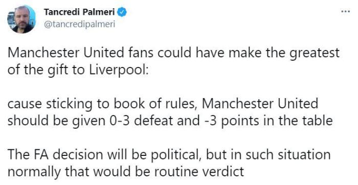 按照规定, 曼联本场比赛应该被判0-3失利,并且在积分榜上扣除3个积分。