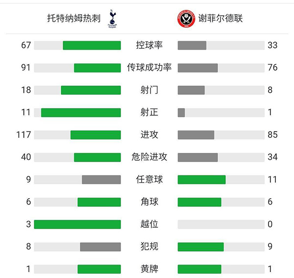 全场比赛结束,热刺4-0谢菲尔德联。