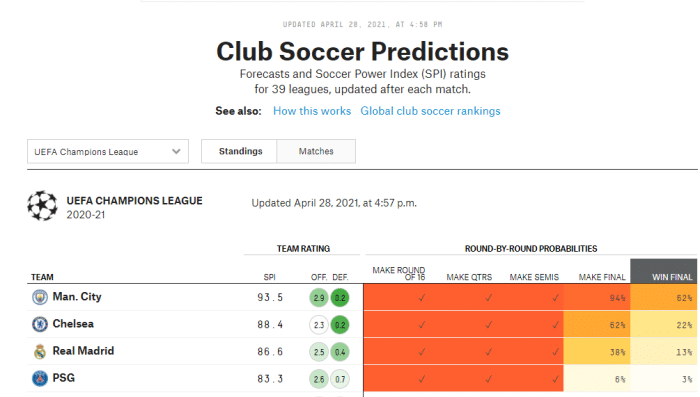 来源:24直播网04-29 15:4524直播网讯 欧冠半决赛首回合的比赛结束了,切尔西客场1比1站平了皇马,而曼城则客场2比1战胜了巴黎。这两场比赛结束之后,著名的大数据网站“538”也及时更新了各队晋级欧冠决赛和夺得欧冠冠军的几率,其中曼城和切尔西两支球队被看好会师决赛,而皇马和巴黎都被看衰了,他们进入决赛和夺冠的几率都很低,好了话不多说一起看数据吧!