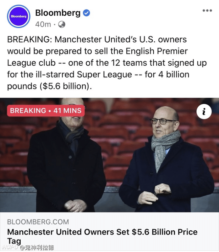 彭博社称,格雷泽为曼联标价56亿美元(40亿英镑),《镜报》也称格雷泽愿意40亿英镑出售曼联,而2005年他们花7.9亿英镑买下了红魔。