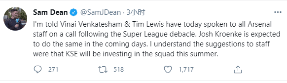 在退出欧超联赛后,枪手总监文卡特瑟姆和高层蒂姆-刘易斯今天与阿森纳全体员工进行了对话,克伦克的儿子乔什-克伦克有望在未来几天也与员工进行对话。