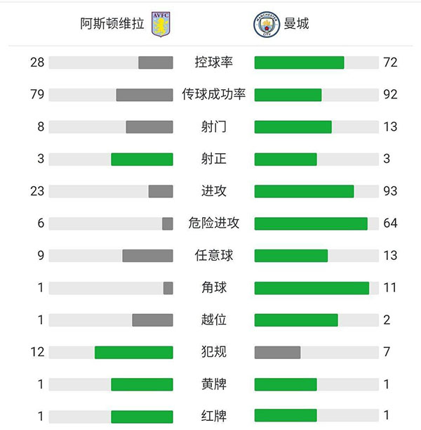 曼城2-1阿斯顿维拉 B席两助福登建功斯通斯卡什染红